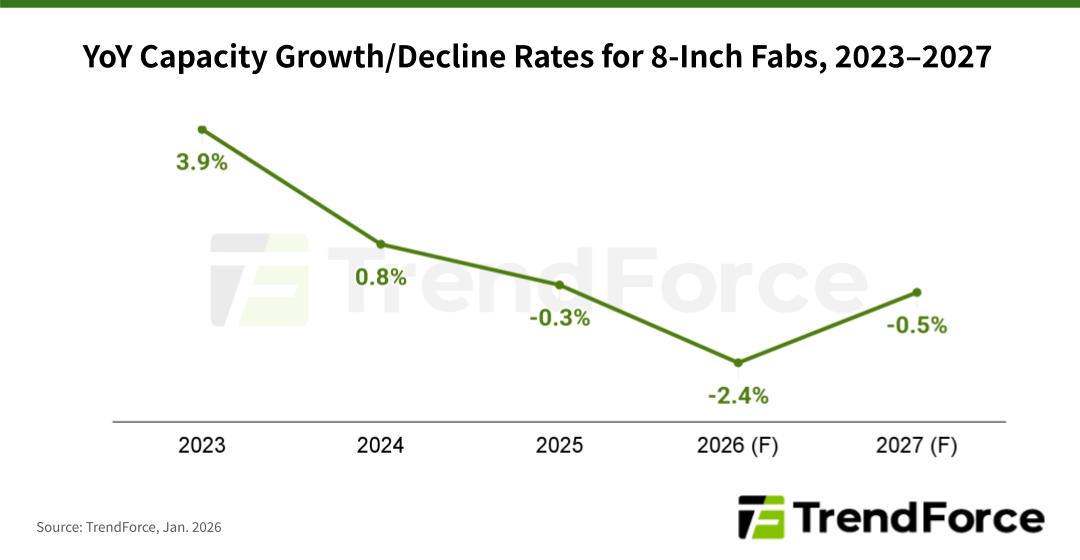 TSMC formally began phasing down 8-inch capacity in 2025, with plans to fully shut down some fabs by 2027. Likewise, Samsung also initiated 8-inch capacity reductions in 2025, adopting an even more aggressive stance. TrendForce estimates that global 8-inch capacity will decline by about 0.3% year-over-year in 2025, marking the start of negative growth. Although players such as SMIC and Vanguard have planned modest capacity additions in 2026, these will fall short of offsetting the cuts by the two leading foundries, widening the projected capacity decline to 2.4%.